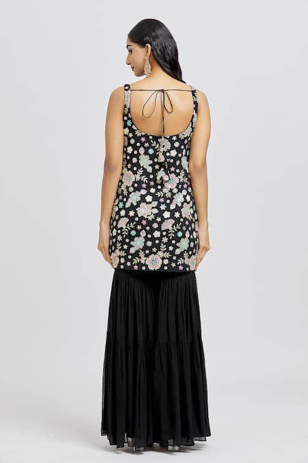 Black kurta featuring floral embroidery with cutdana, sequin, beads, thread & zari work. Paired with a matching sharara and a sequin embroidered dupatta.