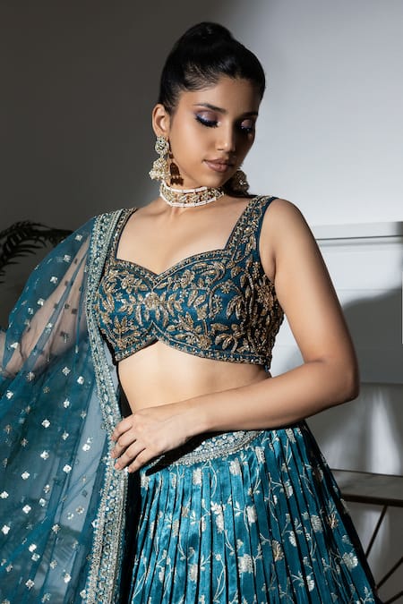 Teal blue floral jaal embroidered lehenga featuring a pleated silhouette. Accompanied by a padded blouse with dabka and zarkan work, and a net dupatta with butti work and golden detailing.