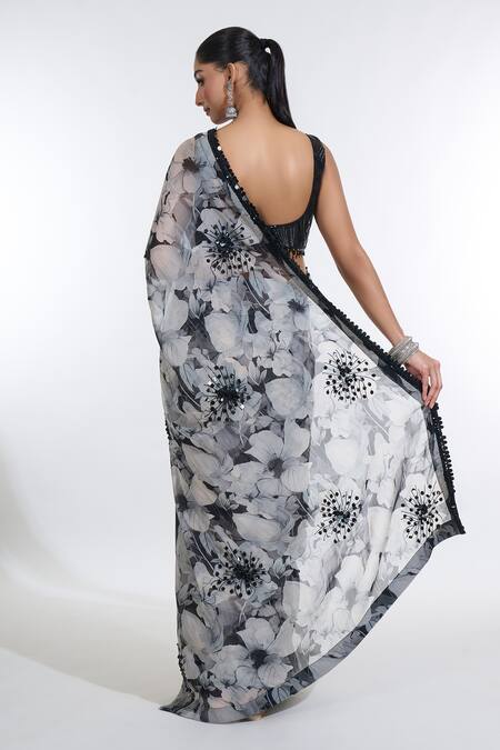 Black and white saree featuring a floral print with a sequin embroidered border. Accompanied by a padded embroidered blouse with attached lining.
