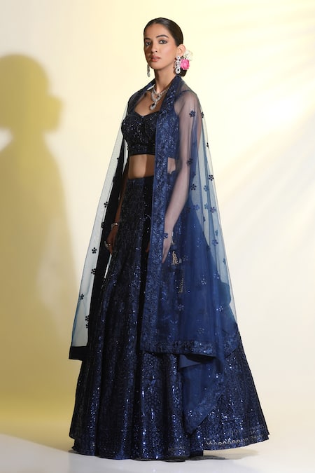 Blue embroidered lehenga featuring floral cutdana, sequin, and resham work. Paired with a matching padded blouse and dupatta.