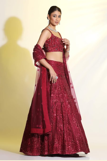 Maroon lehenga featuring floral embroidery with cutdana, resham, and sequin work. Paired with a padded embellished blouse and a matching dupatta.