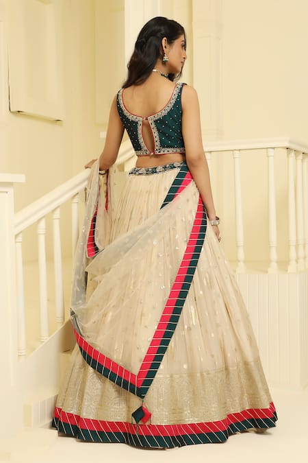 Gold Net, Linen Embroidery, Cut Work Flower And Temple Motif Pattern Lehenga Set