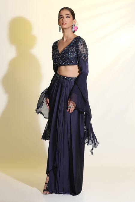 Navy blue blouse with cutdana, mirror, and sequin embroidery flowers. Paired with a draped skirt and organza dupatta.