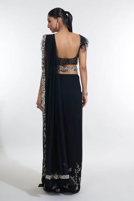 Black pre-draped skirt saree featuring confetti sequin embroidered palla border. Paired with a bead embellished blouse adorned with ostrich feathers and a sequin embellished belt.