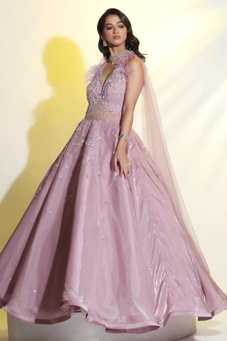 Purple Net Hand Embroidered Cutdana Plunge Neck Ball Gown