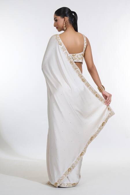 Ivory saree made from Armani satin featuring floral sequin and bead embroidered border. Paired with a floral embroidered padded blouse crafted from net fabric.