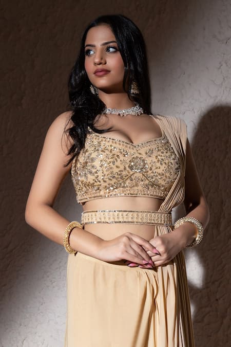 Gold blouse featuring sweetheart neckline with bead, sequin, and cut dana work. Paired with a pre-draped saree that has pleated cowl draped details and an embroidered belt.