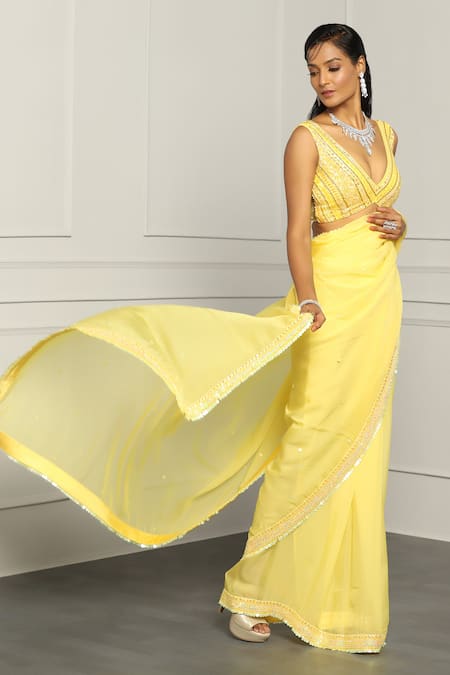 Yellow Net, Viscose, Organza Sequins, Beads Embroidered Saree And Blouse Set