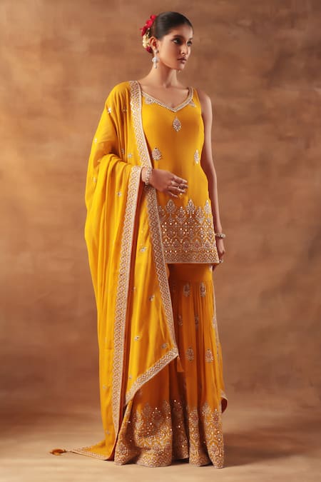 Yellow kurta featuring resham and beads embellishments. Paired with a matching sharara and dupatta.