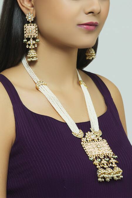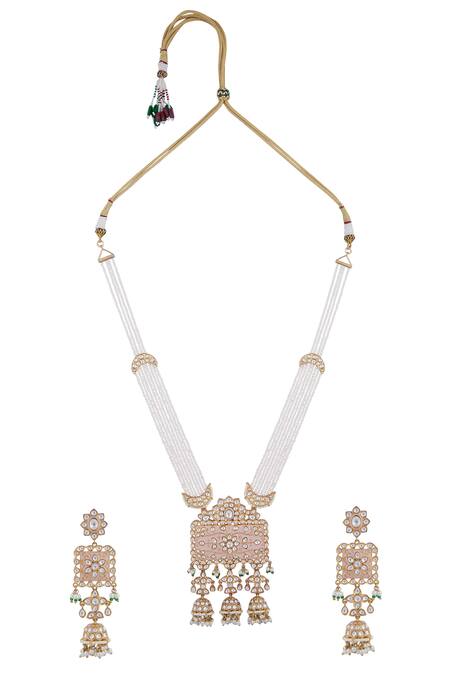 Light pink meenakari necklace with floral kundan motifs. Comes with pearl embellished earrings.