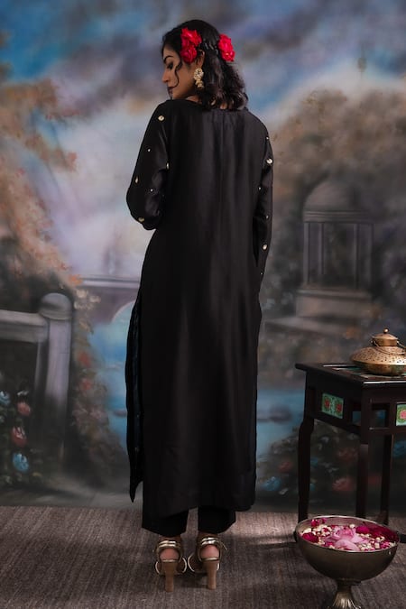 Black Chanderi Silk Sequins, Zari Keyhole Neck Embroidered Kurta Pant Set