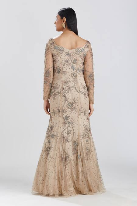 Beige Tulle Sequin, Thread, Cut Dana Zardozi Work One Amber Embroidered Gown