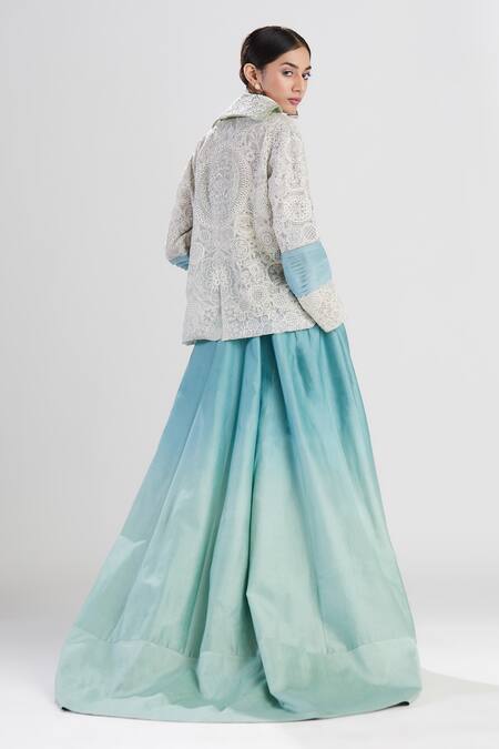 Aqua & celadon ombre deconstructed coat features circular motifs with intricate work, hand embroidered with pearls and resham, engineered with embellished organza trims. Paired with an embellished bustier and a high waisted ombre skirt in hues of aqua and celadon.