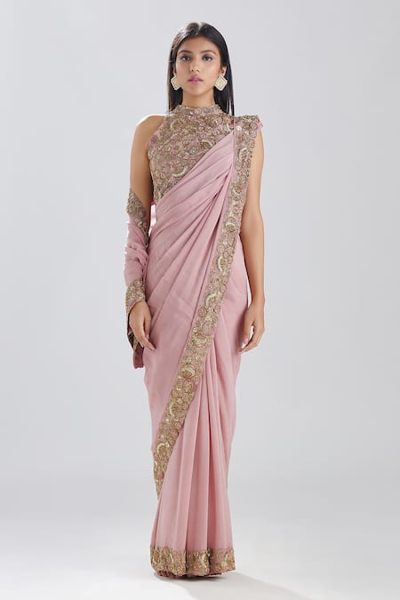 Dull pink crepe saree with copper, antique gold floral & circular pattern zardozi hand embroidered border. Paired with halter neck blouse with all over hand embroidery.