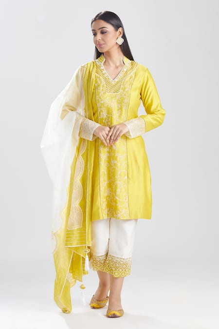 Lime silk chanderi kurta with thread, pearl embroidery on placket. Paired with ivory pant & dupatta.