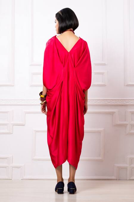 Pink Satin Embroidered Sequins V Neck Draped Kaftan Jumpsuit