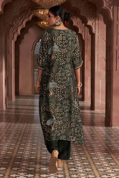Emerald Green Embroidery, Sequins V-neck Floral Printed Kurta Set