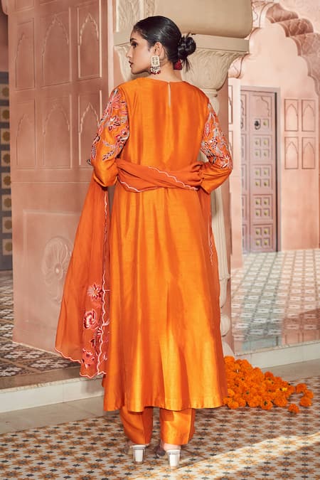 Orange kurta featuring floral embroidery with three quarter sleeves and U neckline. Paired with a plain pant and an embroidered dupatta with a scalloped hem.
