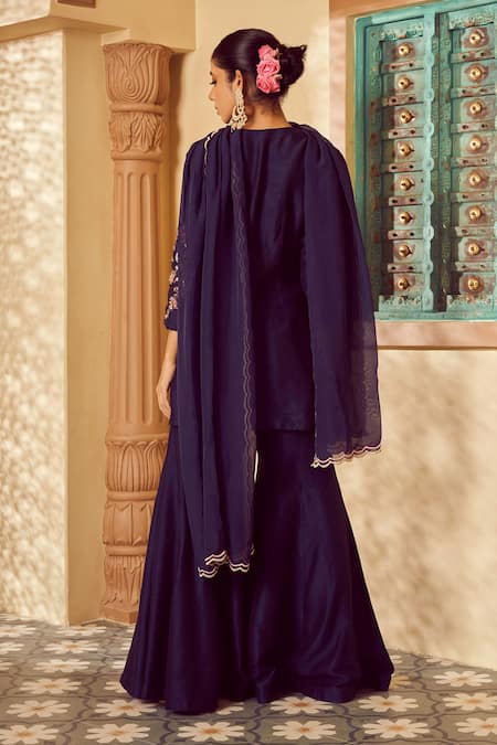 Blue Silk, Bamboo Embroidery V-neck Floral Hand Kurta Sharara Set