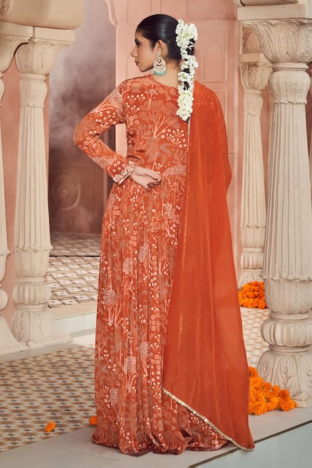 Orange floral printed anarkali featuring a V neck and full sleeves. Paired with a matching pant and dupatta.