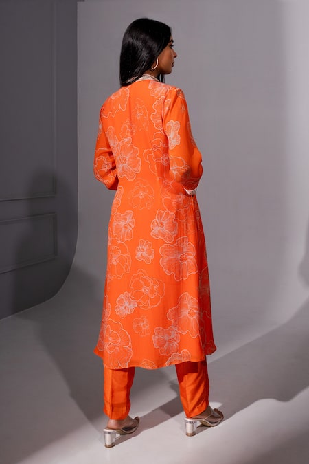 Orange tunic featuring floral prints and hand embroidered collar, placket, and cuffs. Paired with matching pants for a complete look.