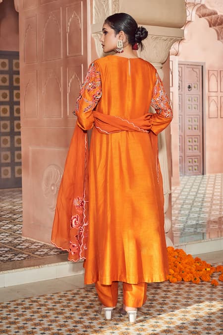 Orange kurta featuring floral and thread hand embroidery with a round neckline and three-quarter sleeves. Paired with matching pant and dupatta, designed for a relaxed fit.