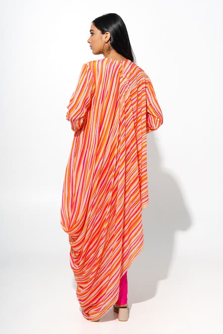 Orange asymmetric hem tunic featuring all-over stripe prints. Paired with matching pink pants for a coordinated look.
