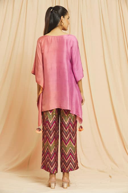 Peach and mauve ombre kaftan featuring tassel bordered edges. Paired with zig zag hand block printed pants.