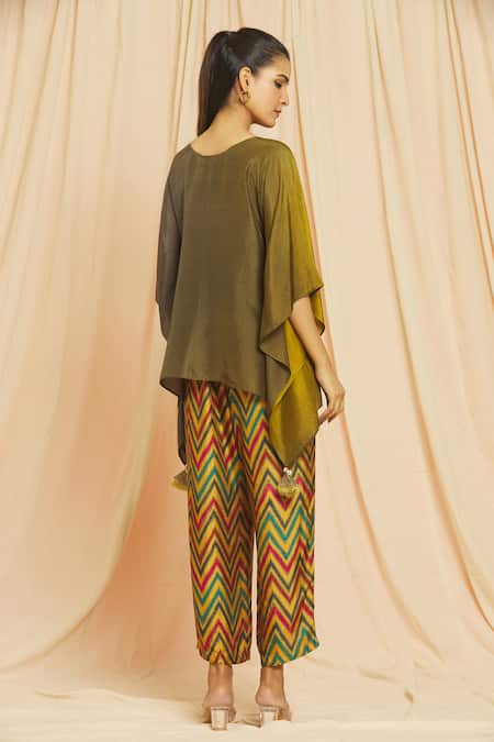 Olive pure silk kaftan featuring kaftan sleeves and round neckline. Paired with chevron printed pant with tassel bordered edges.