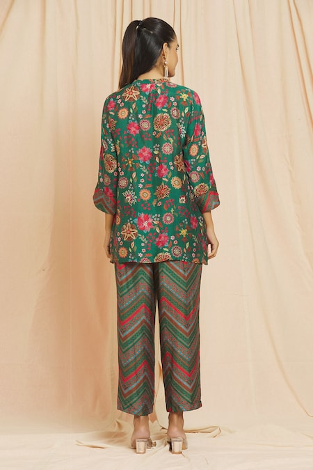 Green silk top featuring a royal floral digital print and mirror embroidered placket. Paired with chevron print pant for a coordinated look.