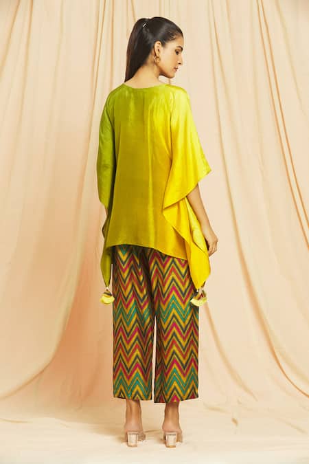 Yellow and green silk kaftan featuring a flared silhouette with tassels. Paired with chevron printed pants in vibrant colors.