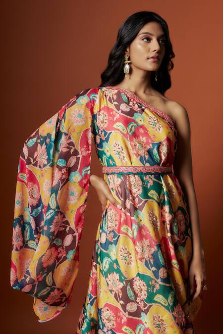 Multi color one-shoulder dress featuring a draped silhouette with floral prints and sequin embroidery. Comes with a matching belt for added style.