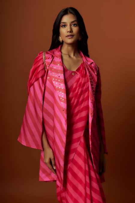 Pink saree featuring a bold stripe print, paired with a padded blouse adorned with sequin and bead embroidery. The set includes a jacket with embroidered lapel and an attached drape, enhancing the overall fusion look.
