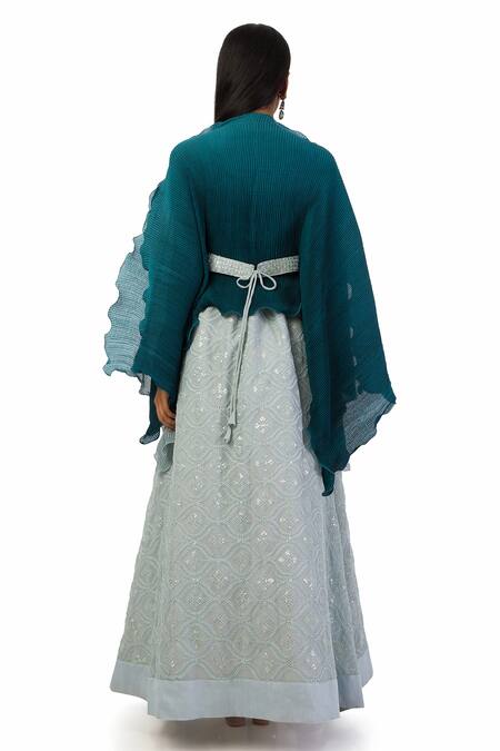 Blue and grey kaftan top featuring a boat neckline and slit sleeves. Paired with a sequin and thread embroidered skirt and an embroidered belt.