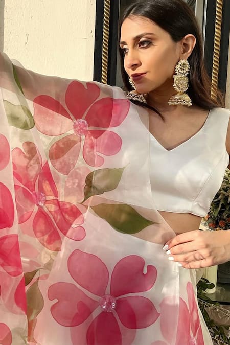 White lehenga featuring hand-painted pink hibiscus flowers and sequins embroidery. Accompanied by a sleeveless padded blouse and a matching dupatta.