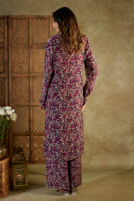 Purple crepe long shirt featuring an abstract floral print with turtle and sequins embroidered collar and sleeve cuffs. Paired with straight pants for a coordinated look.