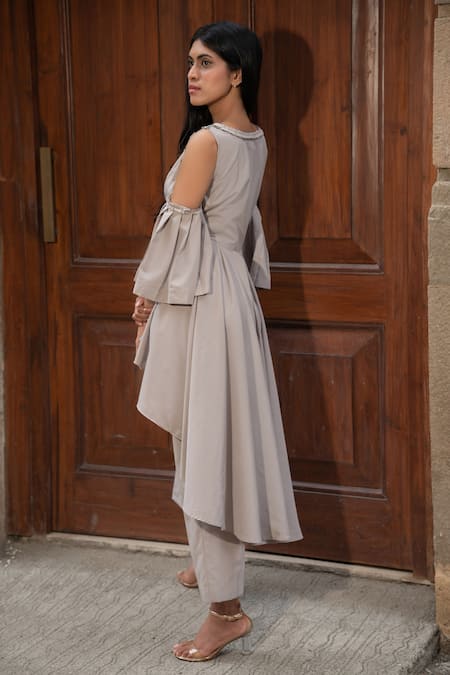 Coffee asymmetric pleated top with floral embellished motifs on shoulder. Paired with pant.