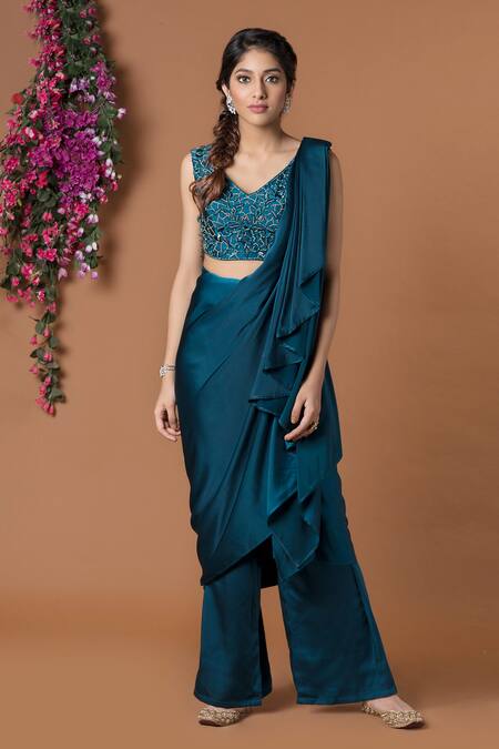 Teal blue pant saree with ruffle detailing at he pallu. Comes with embroidered blouse and belt.