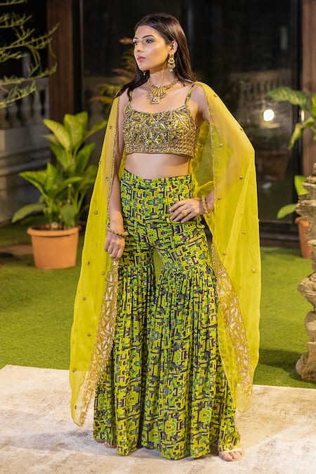 Green blouse with embroidered detailing over zigzag print. Paired with printed sharara & yellow embroidered cape.