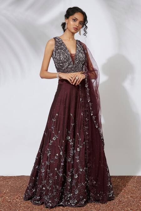 Wine lehenga with all-over embroidery and 3D flower embellishments. Comes with V-neckline blouse and net dupatta.