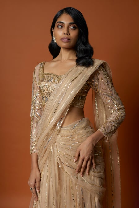 Gold net pre-draped saree featuring pleated detailing and sequins embroidery. Accompanied by a padded blouse with a sweetheart neckline and three-quarter sleeves.