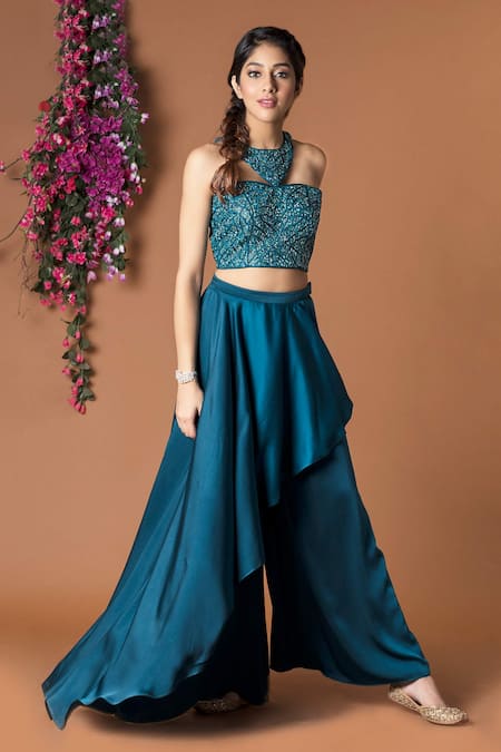 Teal blue crop top with all-over intricate embroidery, round neckline and sleeveless. Comes with draped pant.