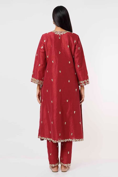 Raspberry red raw silk kurta featuring floral embroidery and a V-neckline. Paired with matching pants adorned with a beaded pallu border.