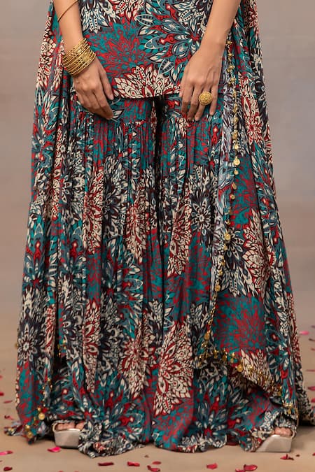 Green cape featuring an all-over floral print with an embroidered border and coin tasselled hem. Paired with a printed short kurta adorned with metallic coin, bead, and cut dana embroidery, along with a flared tiered sharara.