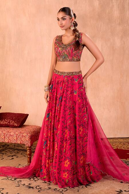 Pink lehenga set featuring a floral printed embroidered blouse. Paired with a flowing plain printed lehenga and a sheer organza dupatta.