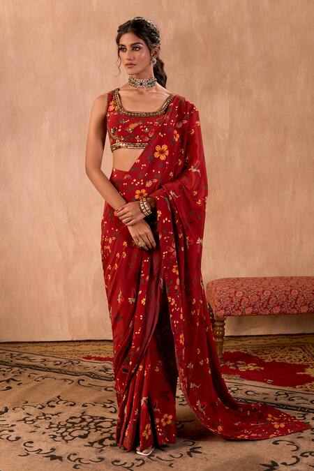 Red pre-draped saree featuring floral print and intricate hand embroidery. Paired with a matching blouse adorned with embroidery details.