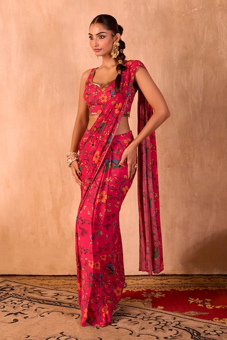 Intricate hand embroidery on the blouse, Rich floral print design on the saree, Pre-draped style for easy wear