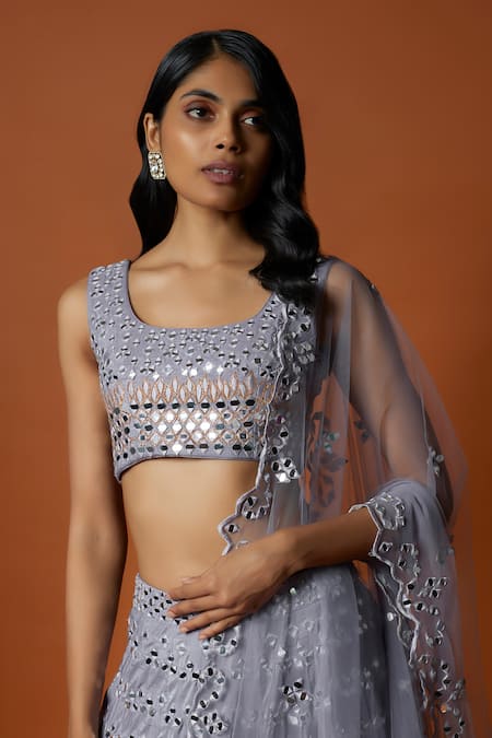 Lilac lehenga featuring mirror and thread embroidery with an attached cancan. Paired with a padded blouse and a dupatta.