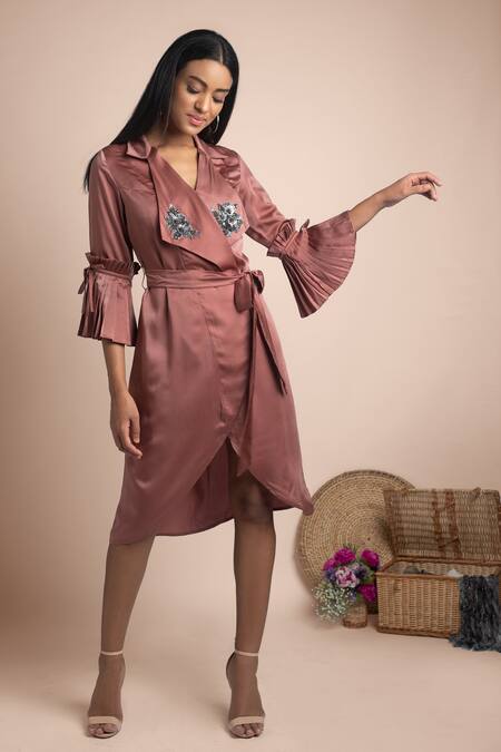 Rose pink trench dress with embellishments at the neckline, knife pleat sleeves and asymmetric hem. Comes with tie-up belt.