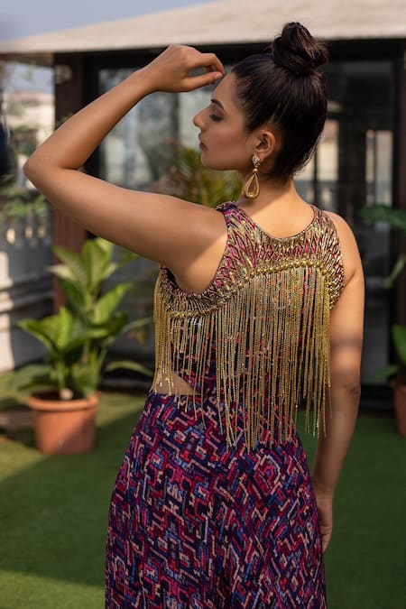 Multicolor gown with zigzag print, side cutouts & chain detailed bodice.